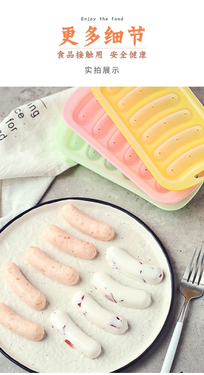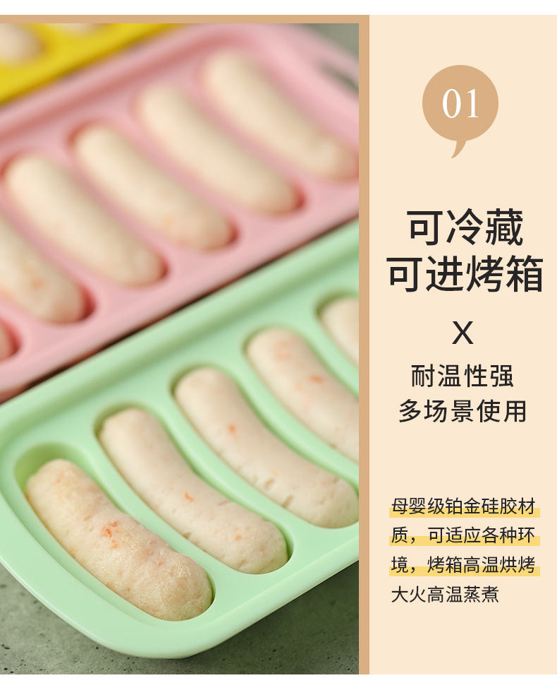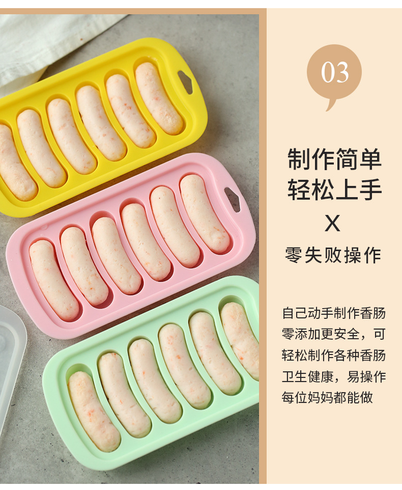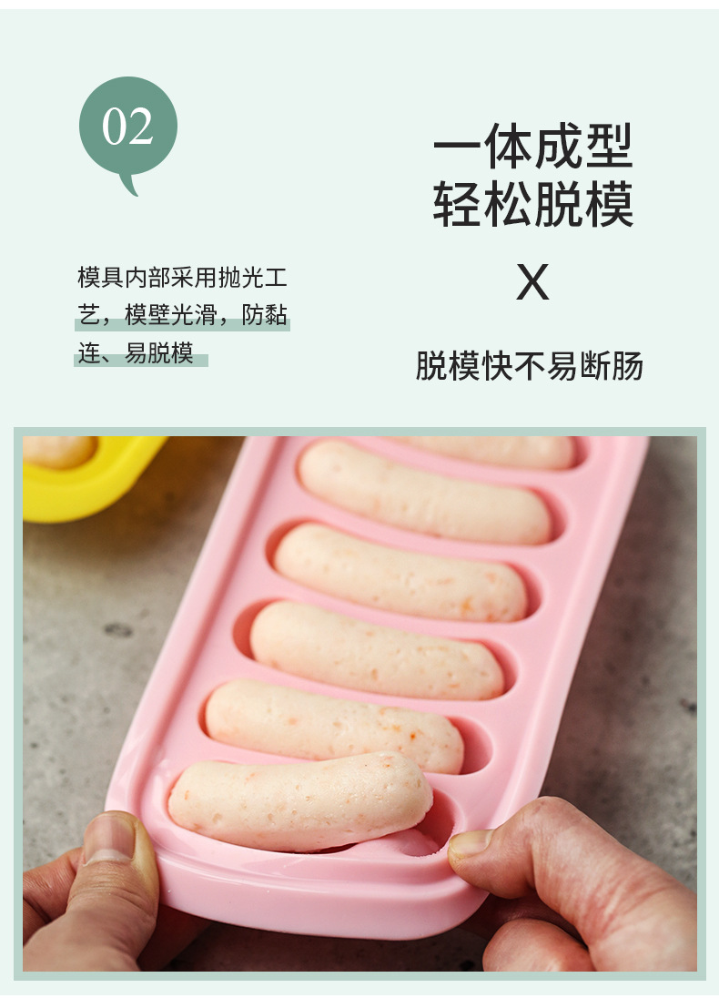 為了對付愛吃零食不吃正餐的寶寶,可以考慮買個硅膠香腸模具,記錄下配方以免下次做忘記了。豬肉+胡蘿卜+玉米+面粉+微量淀粉=糊狀→倒入模具大火燒開蒸十五分鐘。在飲食方面的應(yīng)用,一定要選擇食品級硅膠,固化后的硅膠模具具備著耐高溫性,不會對模具產(chǎn)生影響,也不會影響美食的味道;一定要選擇正規(guī)食品級硅膠,正規(guī)的硅膠廠,正規(guī)的硅膠模具制品!