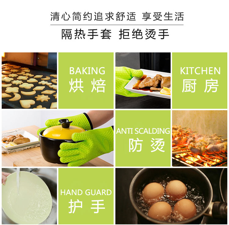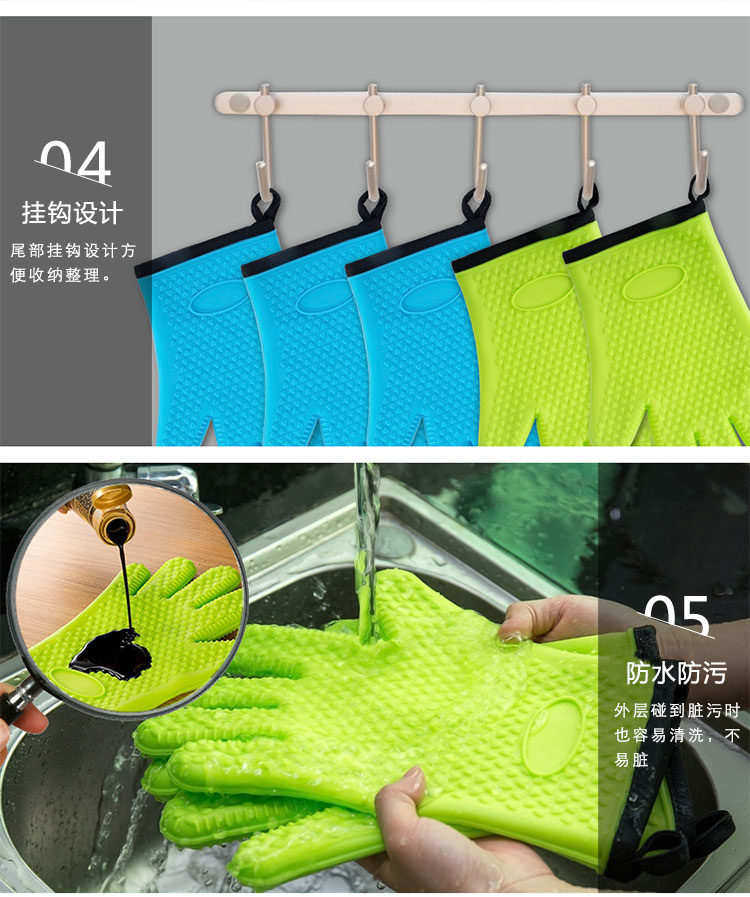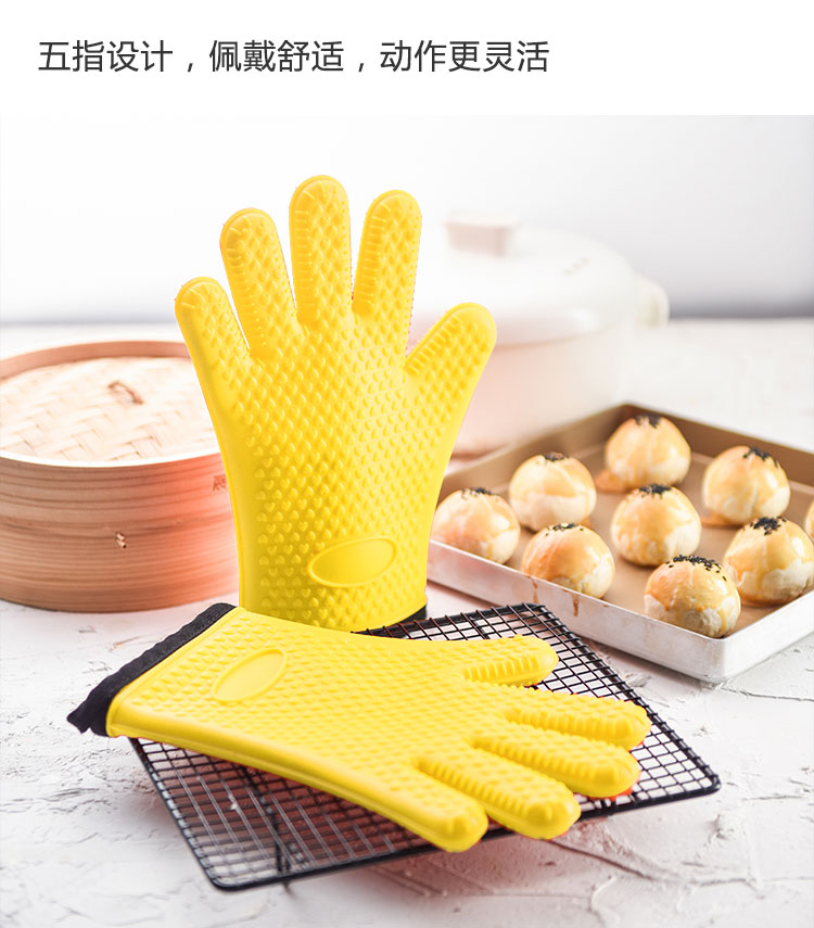 硅膠烘焙手套質(zhì)地柔軟,分指設計,防滑防臟,內(nèi)置隔熱棉,有效保護雙手。