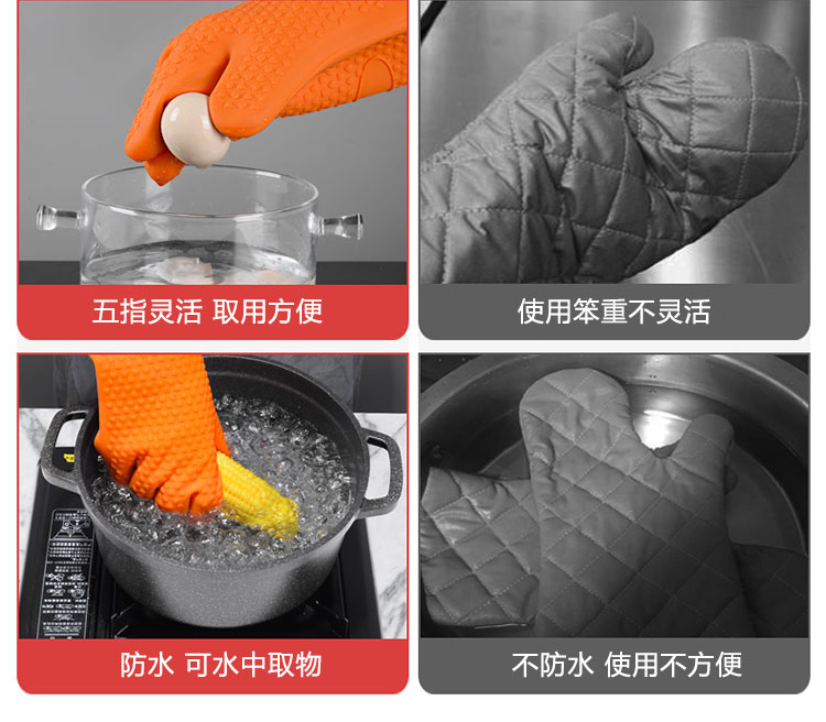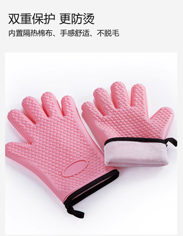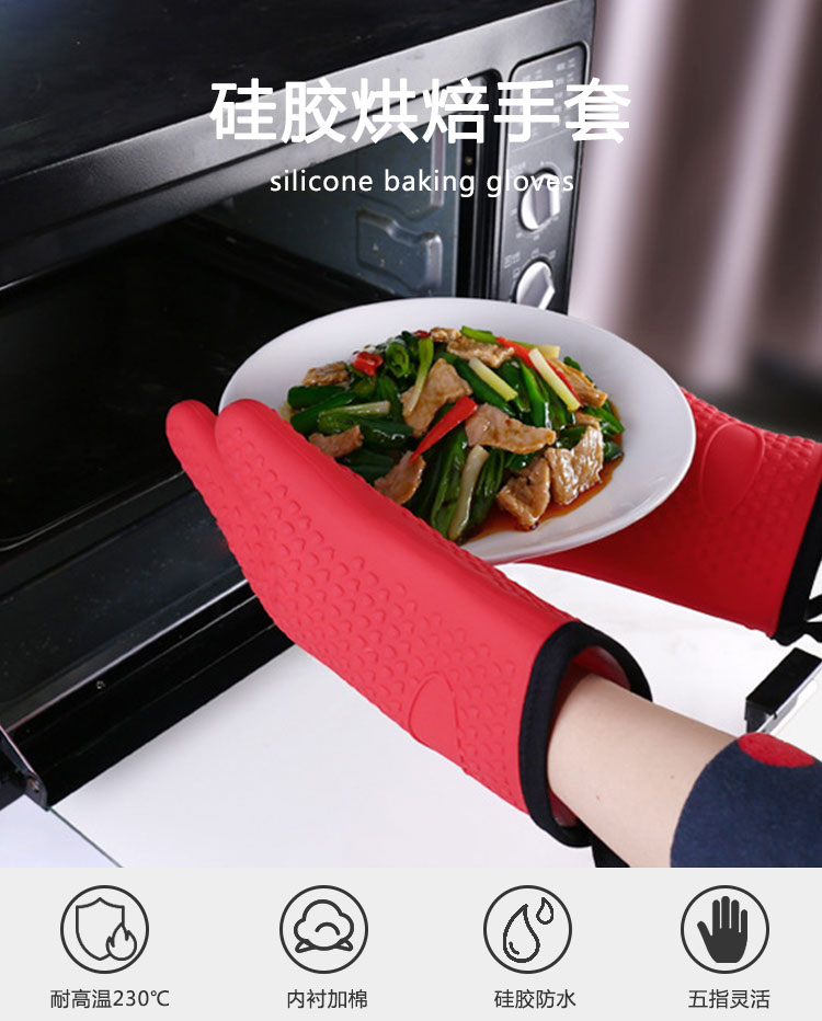 硅膠烘焙手套質(zhì)地柔軟,分指設計,防滑防臟,內(nèi)置隔熱棉,有效保護雙手。